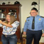 Durante su visita, la cantante recibió un pin representativo de la institución y se medió algunas indumentarias de los bomberos, como cascos y camisas para tomarse fotos con el personal.