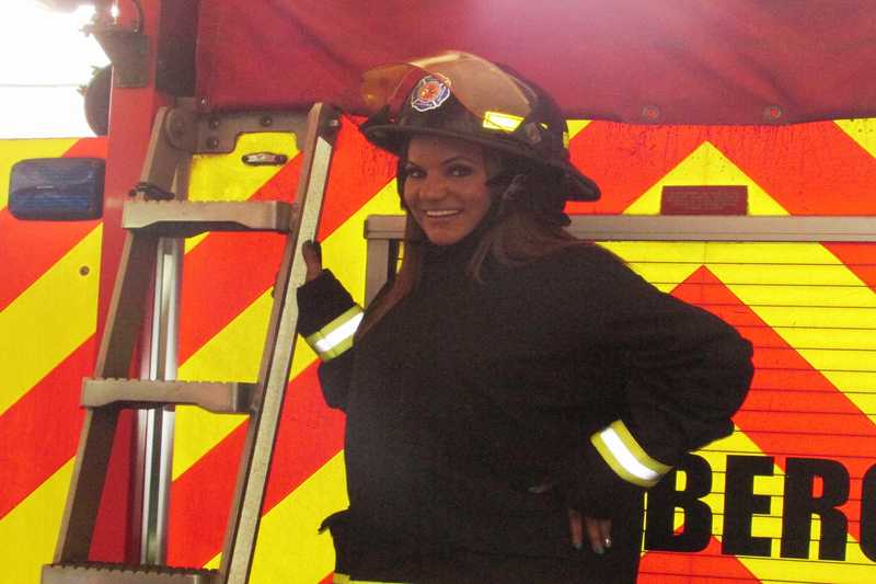 Durante su visita, la cantante recibió un pin representativo de la institución y se medió algunas indumentarias de los bomberos, como cascos y camisas para tomarse fotos con el personal.