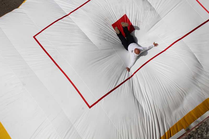 Estos colchones son movibles, por lo que se despliegan donde se tengan que utilizar, ya sea bajo la lluvia, nieve o el sol. Tienen un recuadro donde se señala donde la persona tiene que saltar.