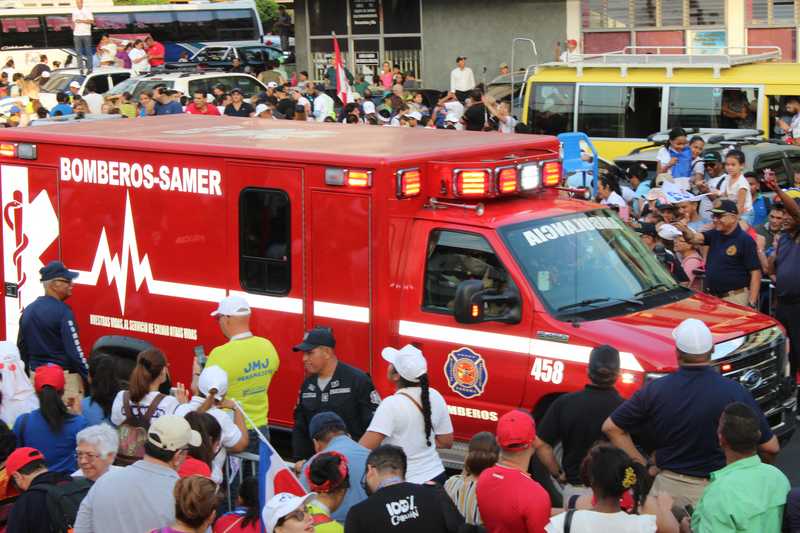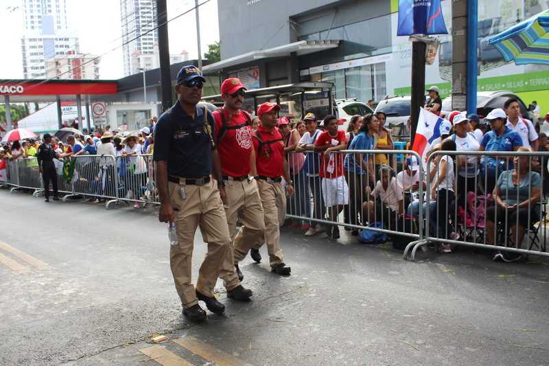 Bomberos voluntarios, permanentes y administrativos se desplegaron a lo largo de las diversas vías de la ciudad capital, este miércoles 23 de enero de 2019, por motivo de la llegada del Papa Francisco a suelo patrio.