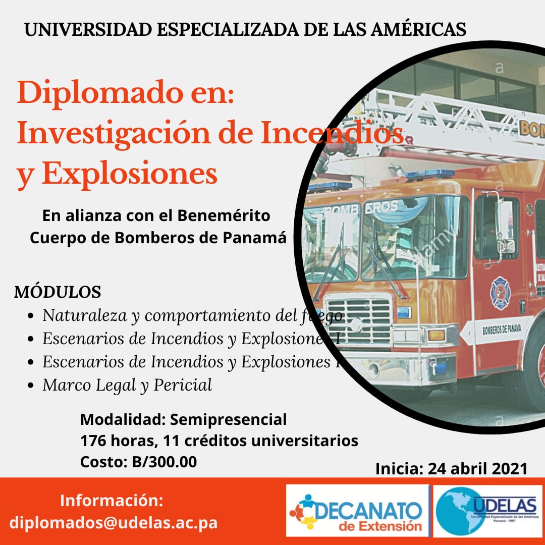 El Benemérito Cuerpo de Bomberos de la República de Panamá (BCBRP) y la Universidad Especializada de las Américas (UDELAS) iniciarán el próximo 24 de abril el Diplomado en Investigación de Incendios y Explosiones, dirigido al personal bomberil.