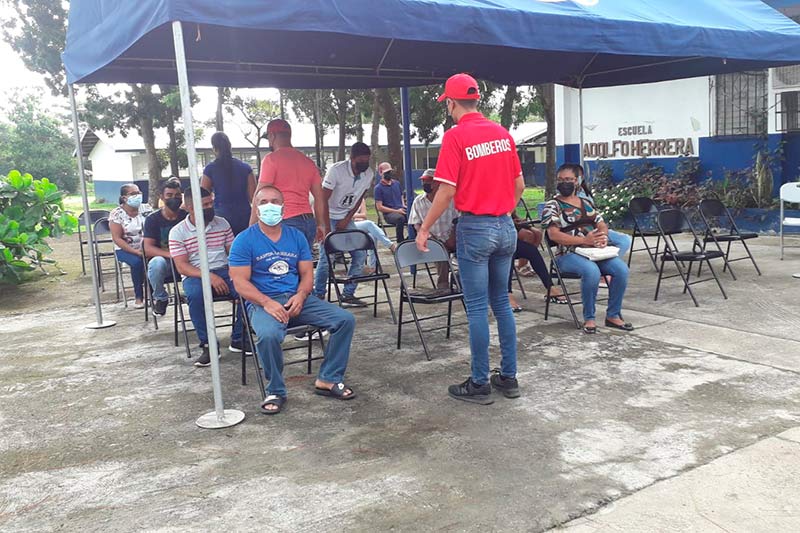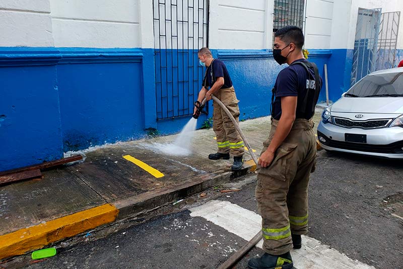 En Panamá, personal de Extinción, Búsqueda y Rescate de Panamá Metro de la Estación Plaza Amador apoyó la limpieza de la Escuela Manuel J. Hurtado, para la jornada de vacunación. PanaVac19.