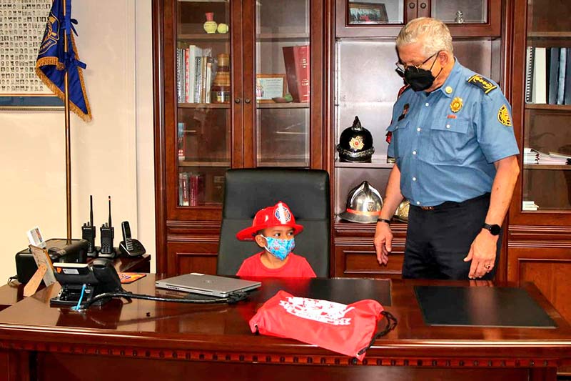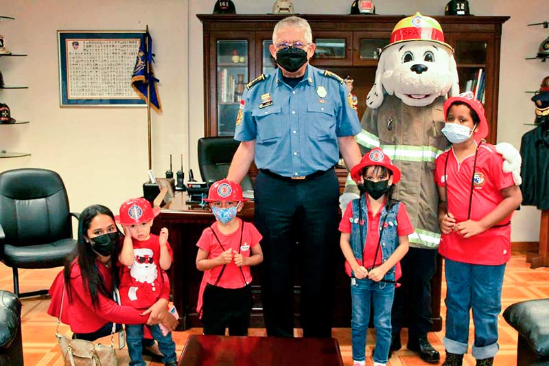 El coronel Abdiel Solís Pérez, Director General, recibió a los pequeños Eduardo, Sofia, Ayden y Jahmir, quienes disfrutaron de una divertida tarde en la Estación Ricardo Arango, conocieron la labor que realizamos en la comunidad y junto a Sparky, realizaron un recorrido en el camión de extinción.