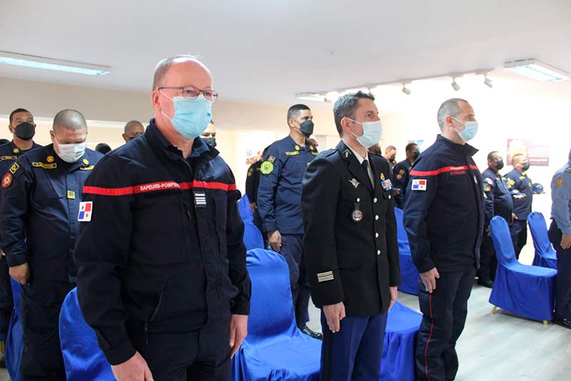 El acto fue presidido por el coronel Abdiel Solís Pérez, director general del Benemérito Cuerpo de Bomberos de la República de Panamá (BCBRP); la coronel Matilde Torres, subdirectora general, y el embajador De Sury D’Aspremont y el teniente coronel Nicolás Parra, Agregado Adjunto del Interior de la embajada de Francia en Colombia.