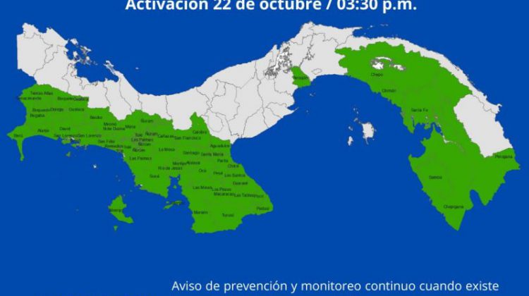 El Sistema Nacional de Protección Civil (SINAPROC) informa a la población que, debido a las condiciones climatológicas actuales y con el objetivo de salvaguardar la vida y los bienes de los ciudadanos, se declara ALERTA VERDE a nivel nacional, a partir de las 3:30 p.m. de este miércoles 22 de octubre de 2025.